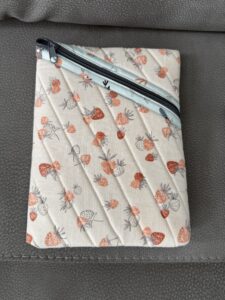 A flat pouch with diagonal zipper, either 9″x 12″ or 11″x 13″