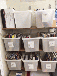 - Books are organized by topic and labeled with a numbering system